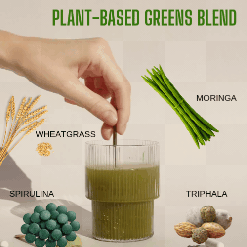 Including spirulina, wheatgrass, moringa, and triphala (traditional Ayurvedic blend)
